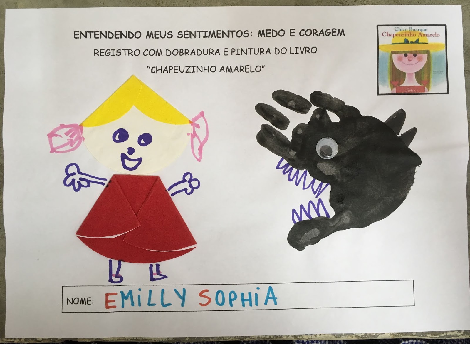 Atividadereferente ao livro:ChapeuzinhoAmareloAutor: Chico Buarque Ilustrações: Ziraldo Editora: José Olympio Sinopse:ChapeuzinhoAmareloconta a história de uma garotinha amarela de medo. Tinha medo de tudo, até do medo de ter medo. Era tão medrosa que já não se divertia, não brincava, não dormia, não comia.
